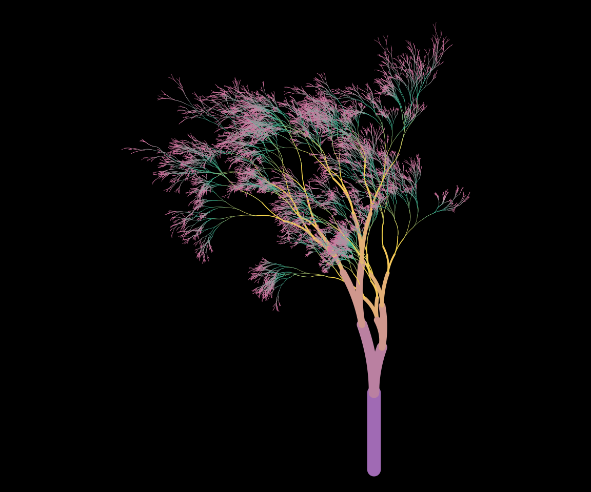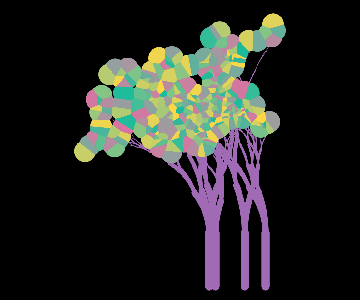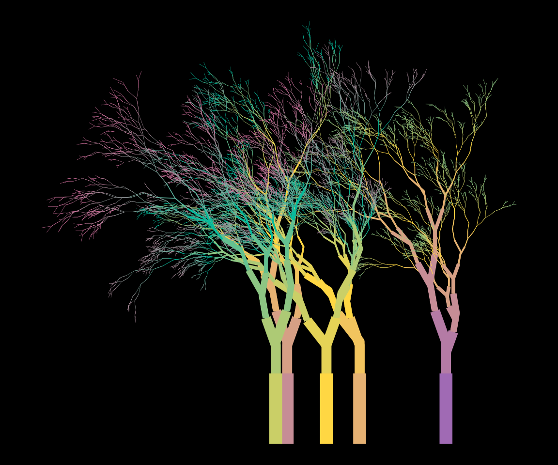 bodies are uniform in colour, and coloured “leaves” are drawn at the top